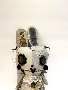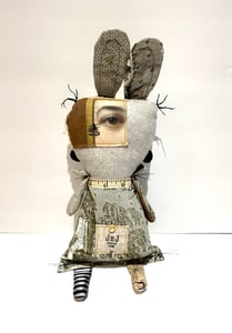 This is a one of a kind folk art doll. Made from a mix of new and vintage fabric. It measures approximately 14 inches tall while sitting by 6 inches wide (hem area) Full length hanging approx 16 inches long. Not intended for children.